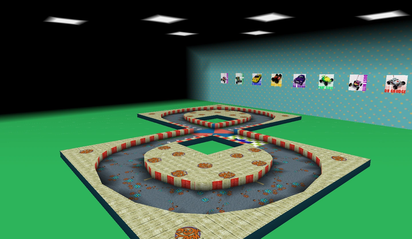 A track is the virtual place on which the cars race on. Cars race around the track a certain amount of times (depending on the lap count) in an attempt to finish the race as fast as possible. Consisting of the world file (w.), the environments of tracks vary, such as a supermarket or museum, environment that supplement the world of Re-Volt and its RC cars.