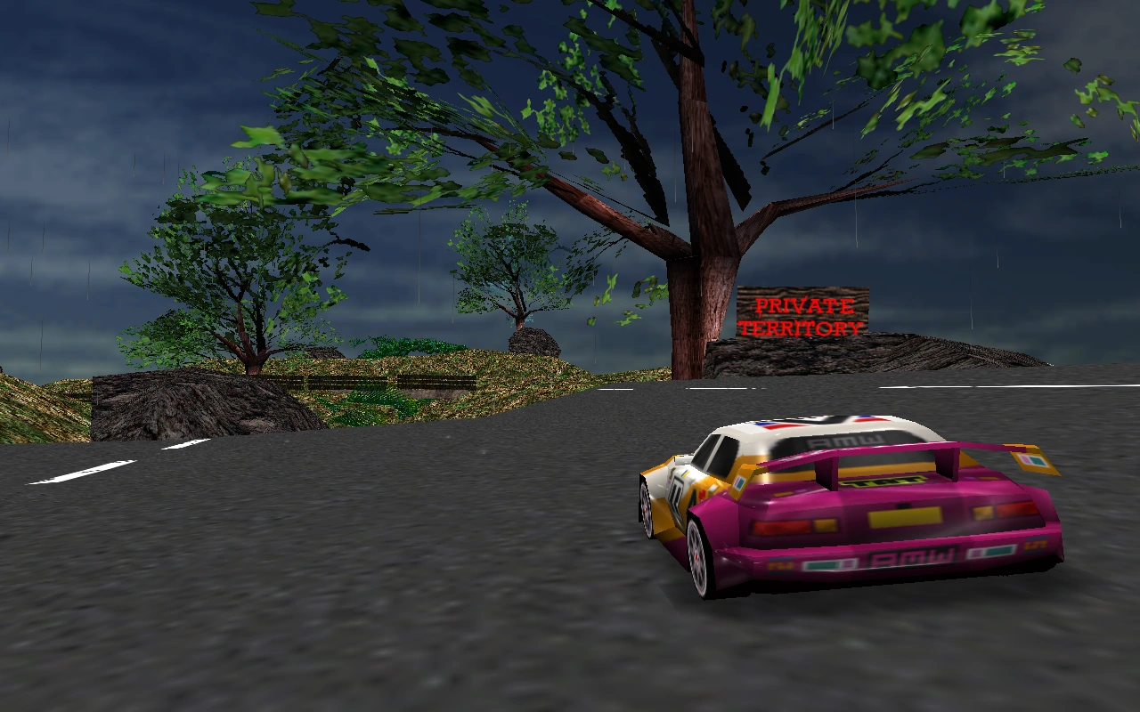 The graphics of Forgotten City is in the same structure as they was in RickyD's track kit, since this was the track kit Urnemanden used for making his idea to reality. Most textures is from the original game or from RickyD's track kit, but using Microsoft Paint, Urnemanden made modifications to the road texture (B.bmp), the building textures ( F.bmp & G.bmp) and the sign texture at the off-road part (Top-left corner, D.bmp). The environment of Forgotten City is old, and it is raining almost every day. The sky doesn't look too sunny neither, the skymap from Toytanic 2 was used in order to create a realistic feeling about todays look of this old city. If you find the rain annoying or if you computer is crashing when loading the track because of the rain, delete it in Object Edit Mode using MAKEITGOOD. The rain object is located in a range of 50 meters from the star.