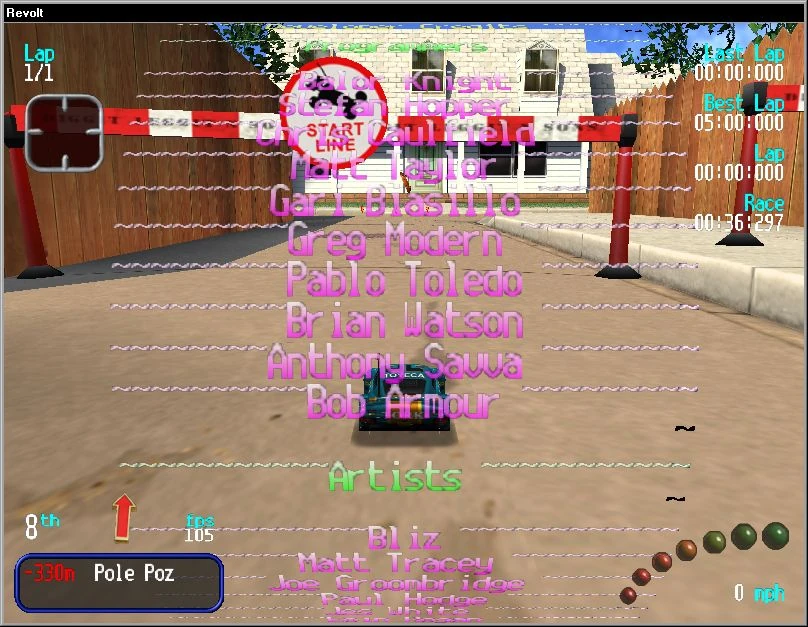 Gimmecredits is a cheat code which is typed on the keyboard during a race. It has no known effect other than to show a list of credits on the screen.